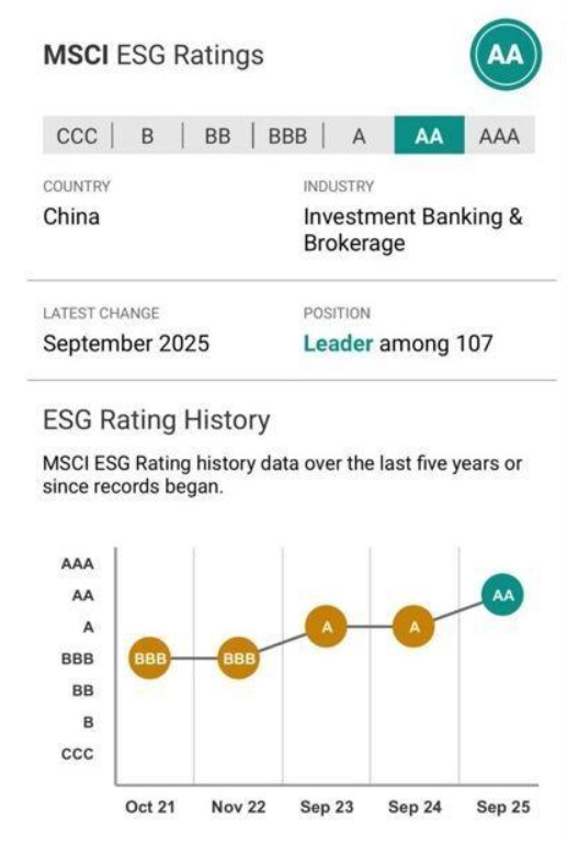 MSCI, the international index provider, recently released its 2025 ESG (Environmental, Social and Governance) rating for China Securities Co., Ltd. (601066.SH; 6066.HK). The Company’s rating was raised from “A” to “AA”, representing another steady advancement along its ESG journey.