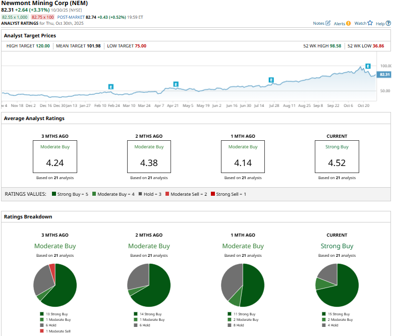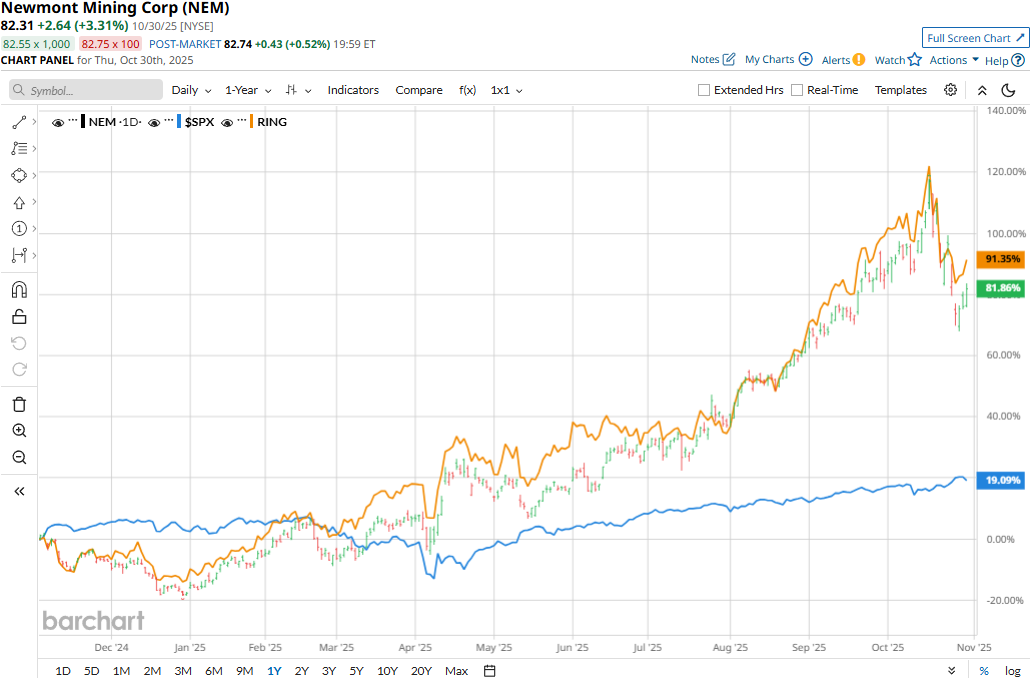 The mining giant has significantly outperformed the broader market over the past year and in 2025. NEM stock has soared 121.1% in 2025 and 75.4% over the past 52 weeks, outpacing the S&P 500 Index’s ($SPX) 16% gains on a YTD basis and 17.4% returns over the past year.
