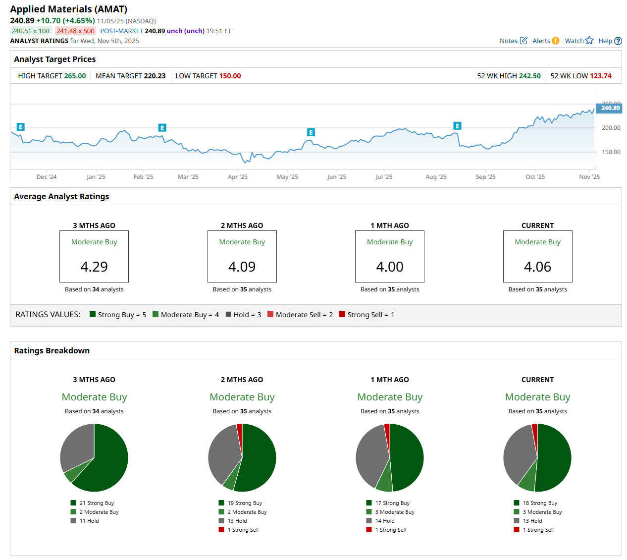 On Nov. 3, AllianceBernstein Holding L.P. (AB) analyst Stacy Rasgon maintained a "Buy" rating on AMAT and set a price target of $195.