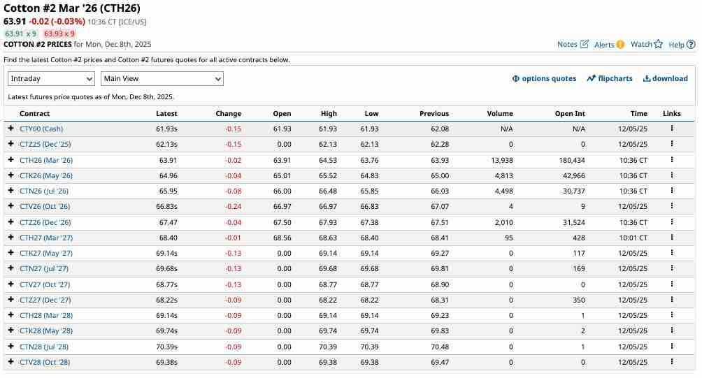 Nearby ICE cotton futures were trading at 64.15 cents per pound on October 10, and were only marginally lower on the active month March futures contract in December 2025.