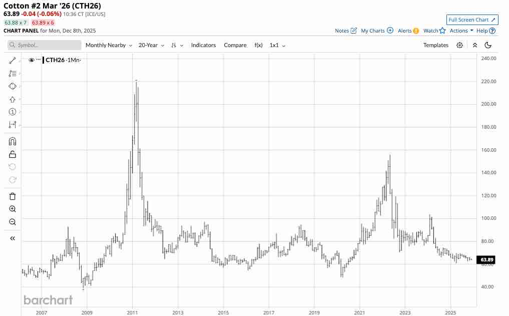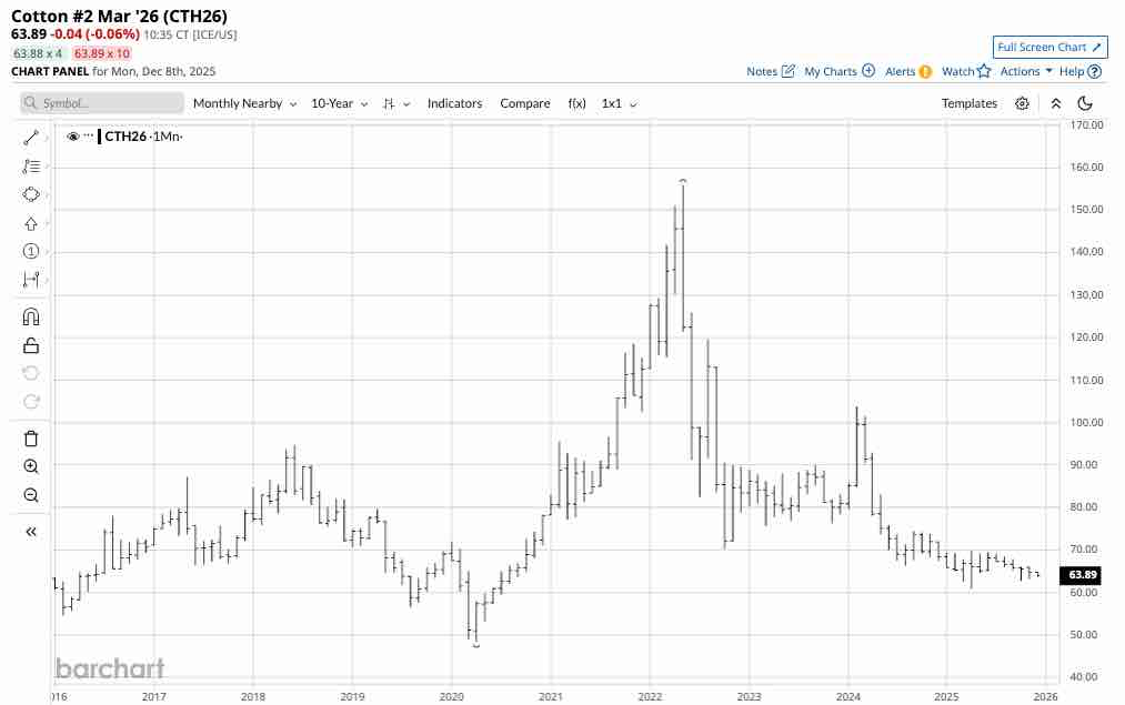 At below 65 cents per pound in December 2025, ICE cotton futures remain in a long-term bearish trend.