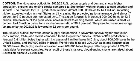 The USDA released its November World Agricultural Supply and Demand Estimates Report on November 14, 2025. The fundamentals for the cotton market included: