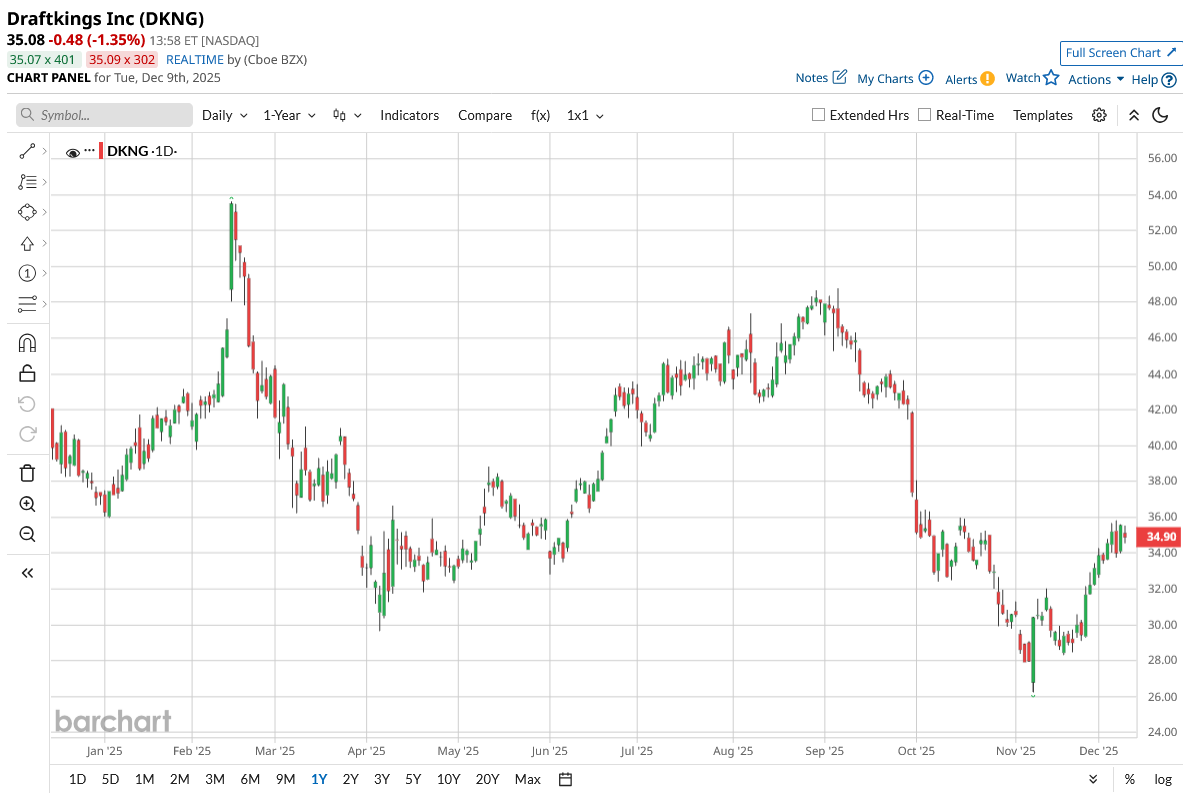 Despite that setup, the stock has had a rough stretch over the past 52 weeks, with DKNG down about 18%, and even on a year‑to‑date (YTD) basis, it is still off roughly 6%, so recent trading has not matched the growth story.