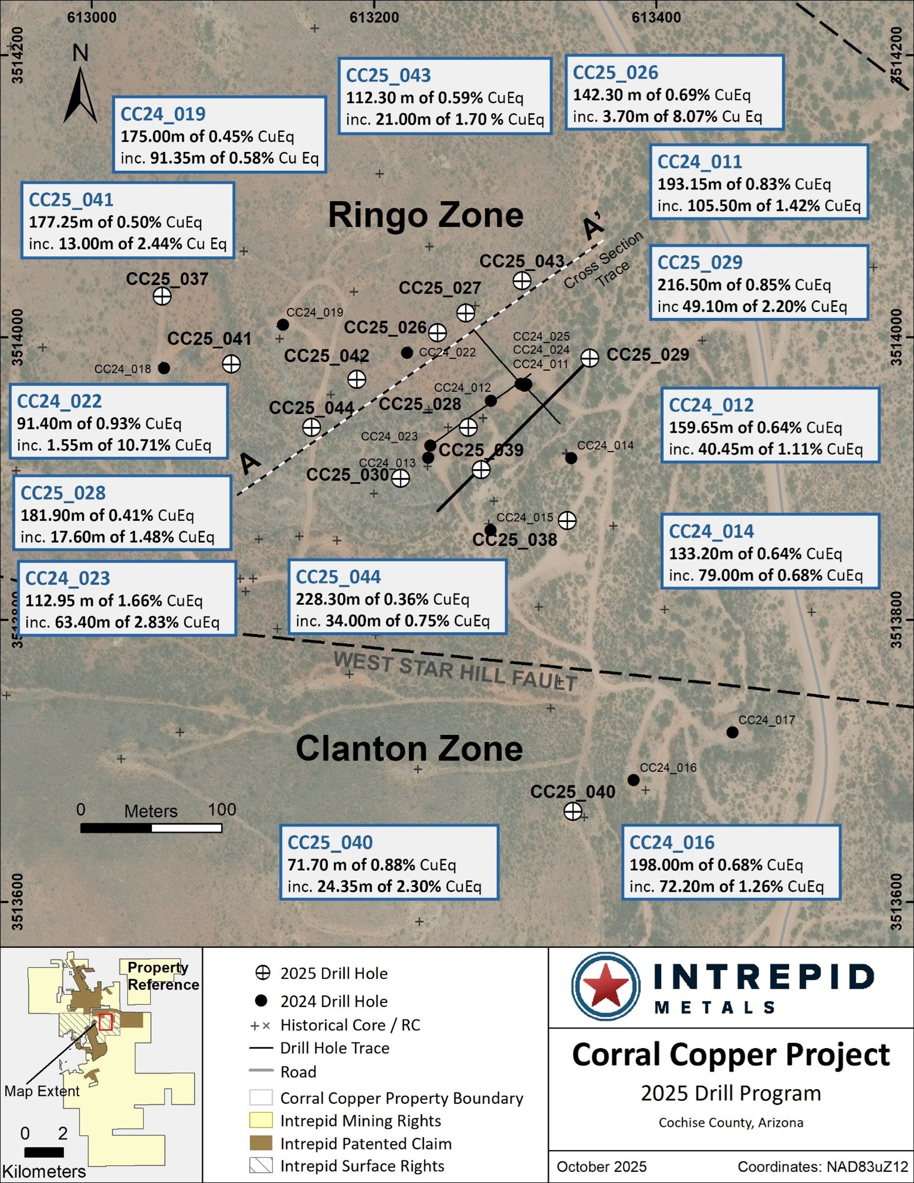 Vancouver, British Columbia--(Newsfile Corp. - November 18, 2025) - Intrepid Metals Corp. (TSXV: INTR) (OTCQB: IMTCF) ("Intrepid" or the "Company") is pleased to provide assay results from two additional diamond drill holes from the Ringo Zone, part of the ongoing 2025 drill campaign at the Company's flagship Corral Copper Property ("Corral" or the "Property") in Cochise County, Arizona (see Figures 1 and 2 below).