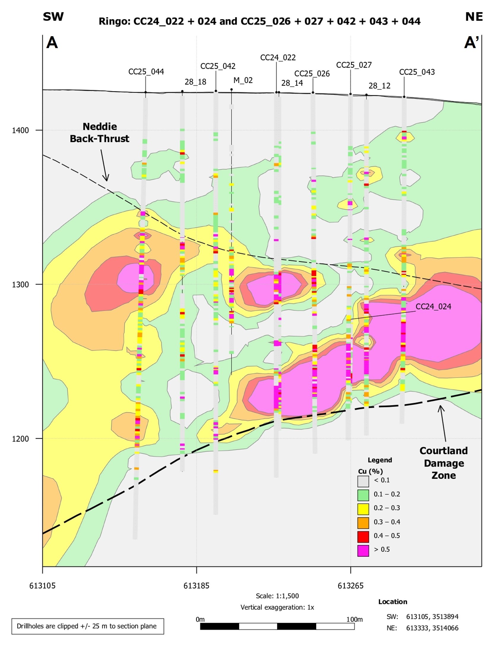 2 Drill hole CC25_043 contains an interval where samples could not be obtained due to loss of recovery during drilling. This interval occurs from 122.55-123.45 (0.9m). This interval is located in a mineralized core run and has been included in composite calculations but has been assigned zero assay values for copper, gold, silver and zinc for purposes of weighted average composite intercept calculations.