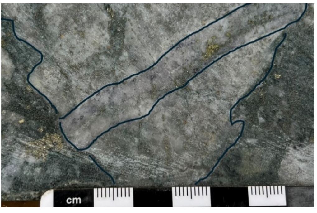 Photo 2: Breccia clasts with chalcopyrite – molybdenite B-veins.