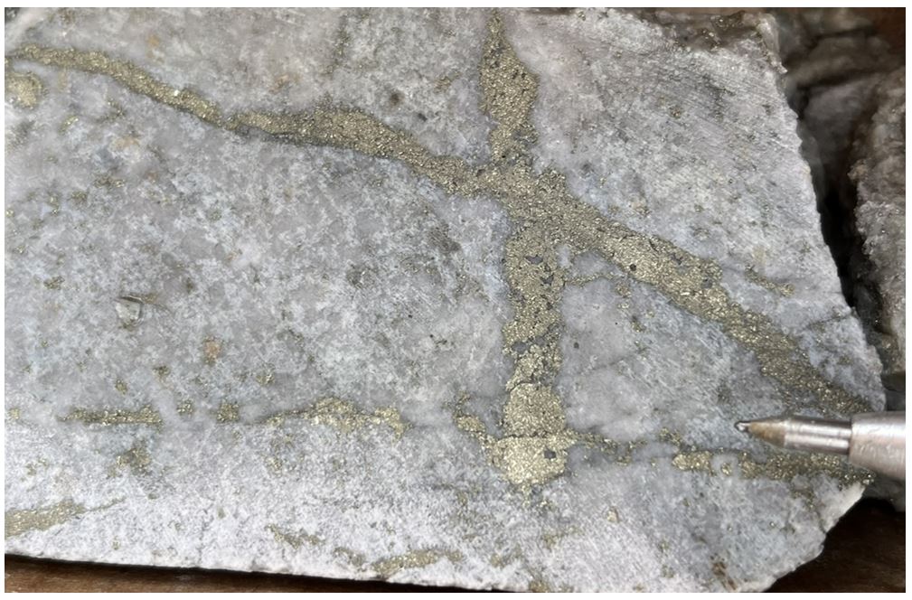 Shallow porphyry-style vein stockworks cross-cut white-mica-altered host rocks (Photo 3). These vein networks are consistent with the upper levels of porphyry systems and commonly occur directly above and/or adjacent to the mineralized core.