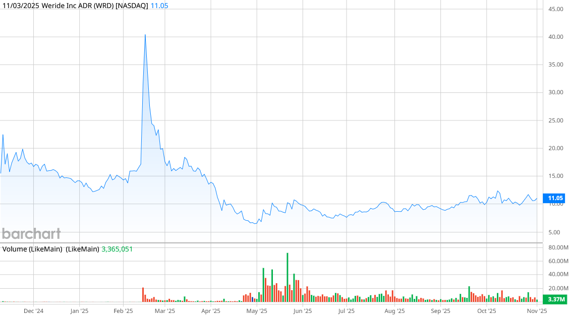 WeRide started trading on the Nasdaq exchange on Oct. 24, 2025, and the stock soared in the first quarter as Nvidia (NVDA) disclosed a $25 million investment but has been steadily dropping since. Since its inception, WRD stock is down 31%. Its year-to-date (YTD) loss of 24% badly trails the Nasdaq Composite ($NASX), which has seen a 23% gain in 2025 so far.