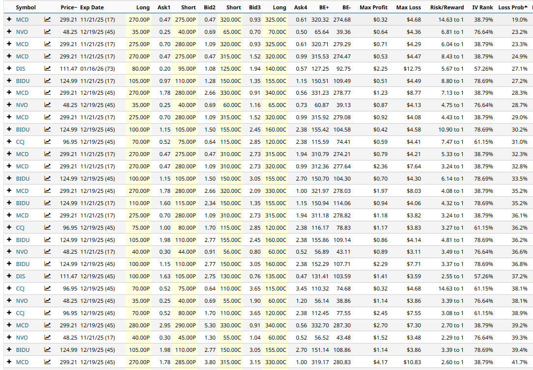 Let’s run an iron condor screener for the above stocks and analyze the results.