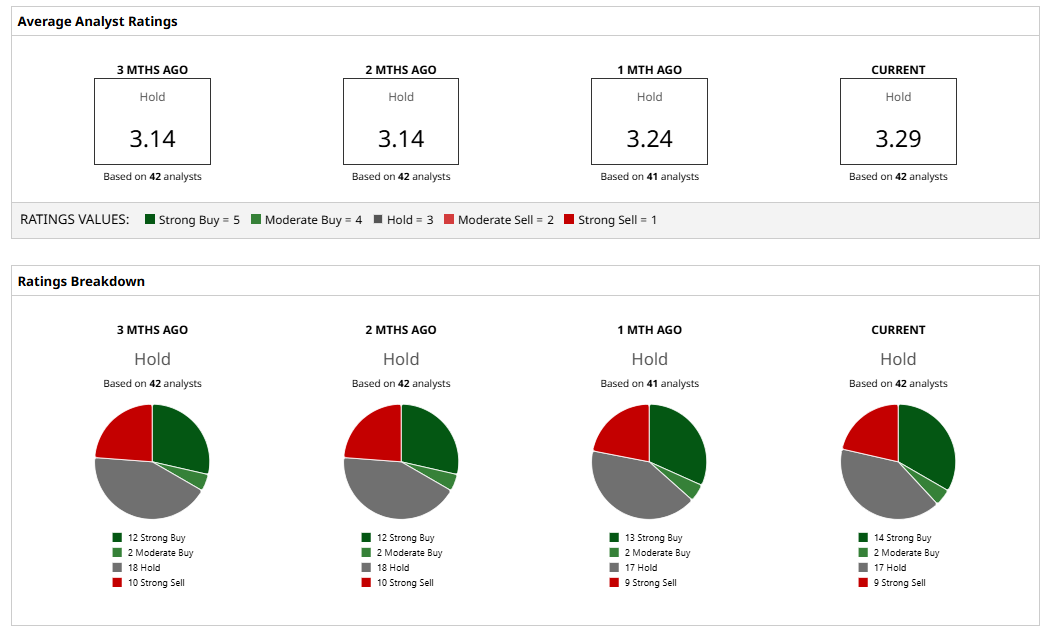 Overall, Wall Street sentiment remains divided on TSLA, with the stock carrying a consensus “Hold” rating. Among the 42 analysts covering the company, 14 have tagged it a “Strong Buy,” two issued a “Moderate Buy,” 17 believe it’s a “Hold,” and the remaining nine suggest a “Strong Sell.”