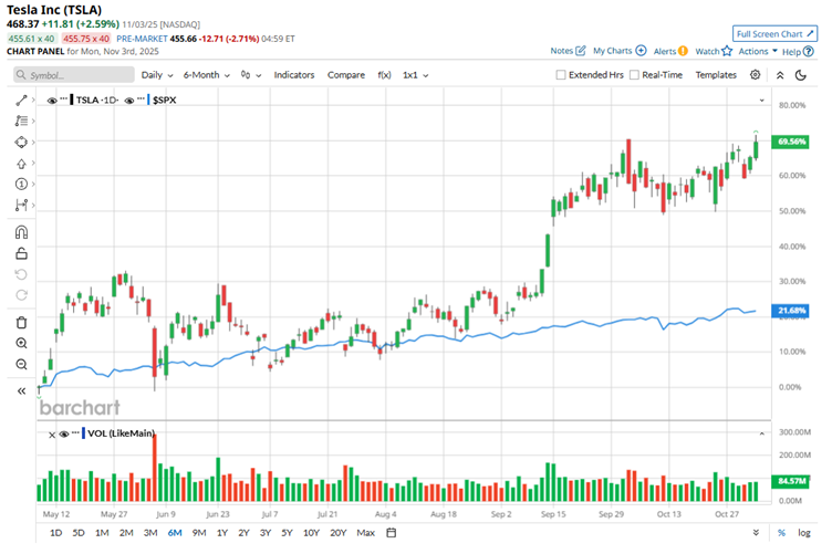 Despite hitting a few bumps this year, Tesla’s stock has performed quite well. It’s up about 11.2% so far in 2025. But the real story is its recent surge, jumping 63% over the past six months and 40.4% in just the last three months. That easily beats the broader S&P 500 Index’s ($SPX) gains of 20% and 6% over the same periods, respectively. In fact, the rally has pushed Tesla’s stock to within just 9% below its all-time high of $488.54, set back in December 2024, signaling renewed confidence in the EV giant’s long-term story.
