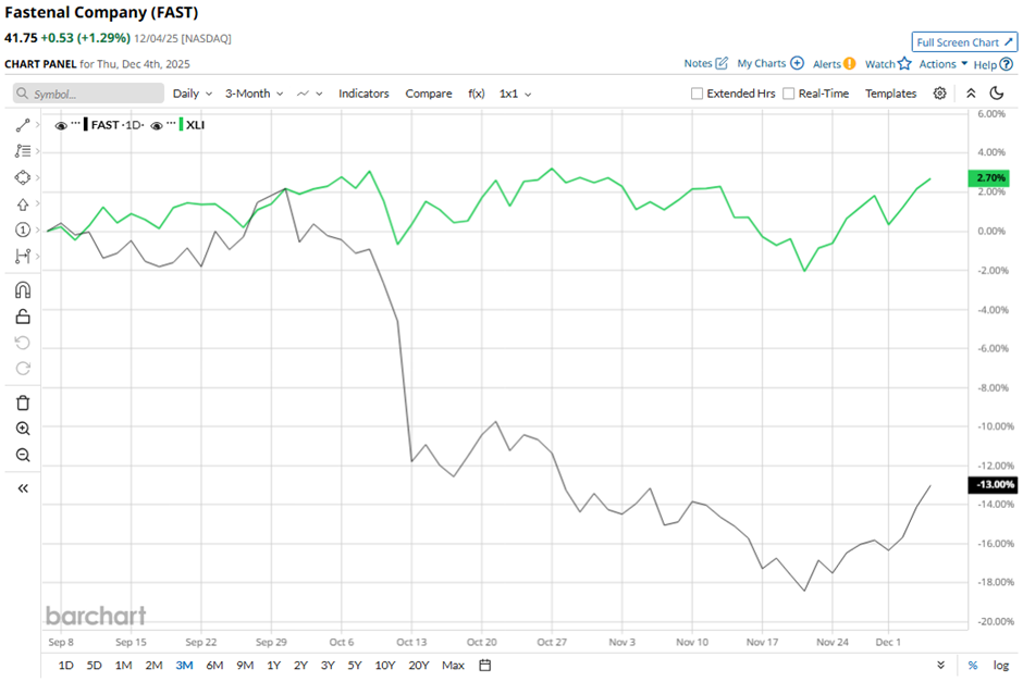 FAST stock has dropped 17.5% from its 52-week high of $50.63. Shares of the company have fallen nearly 17% over the past three months, underperforming the Industrial Select Sector SPDR Fund’s (XLI) 2.3% gain over the same time frame.