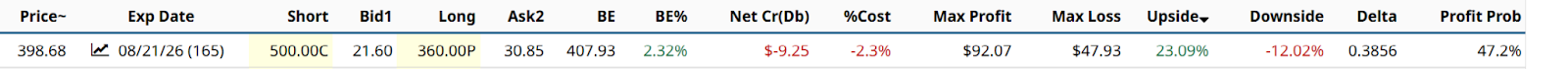 In the above example, I used that $360 level for a put option out to August. And with a stock like this, which can catch a bull wave at any time given its fervent fan base, I targeted upside all the way at $500. TSLA is typically a solid collar stock, and it did not disappoint here. Nearly 2:1 up/down ratio, and a modest 2.3% net cost of the options.
