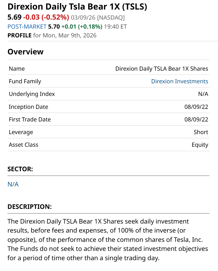 The Direxion Daily TSLA Bear 1X ETF (TSLS) would be the straight bearish way to play TSLA. As shown here, this $80 million ETF, now more than 2 years old, simply moves in the opposite direction of the stock.