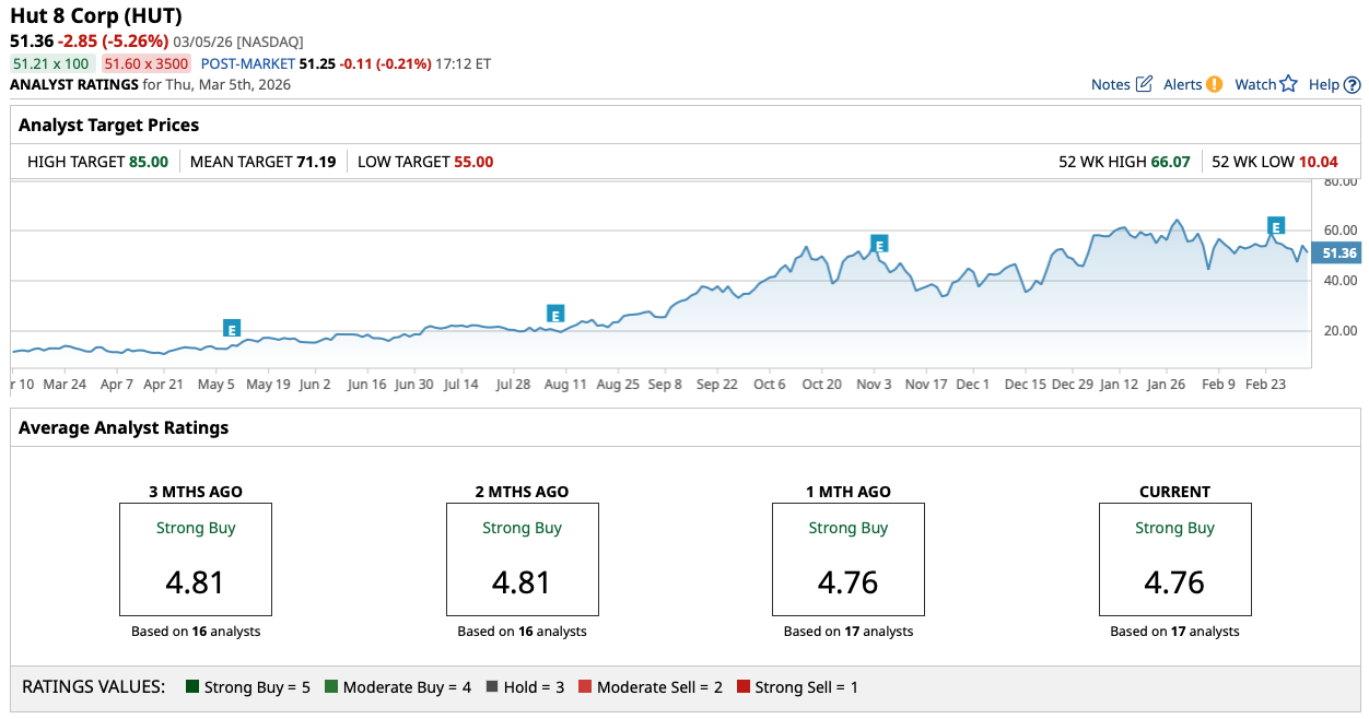 Looking at Hut 8's consensus price target, it's a bit of a different story. While both stocks saw similar declines today due to the same sector-wide pressure (despite the aforementioned commentary out of the Trump administration), this crypto miner's upside is currently sitting at less than 40%, according to a consensus price target of $71.19 per share.