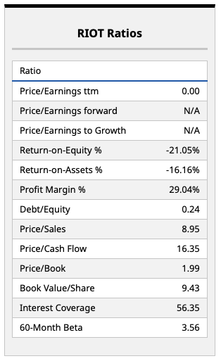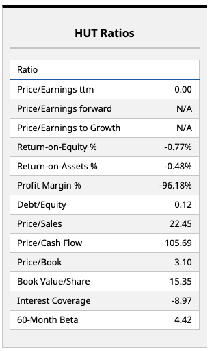 Both companies are looking to move from energy-intensive Bitcoin (BTCUSD) mining operations to companies leasing out their compute capacity to data center operators and others in the AI sector, which will pay a premium for said services right now. Hut's fundamentals, shown above, indicate that this shift is going to take some serious time (and capital) to eventually turn profitable. Indeed, a -96% profit margin is about as bad as it gets, with investors in the company clearly placing their faith in Hut's management team to do the right thing and push for efficiency as soon as possible. At a price/sales ratio of more than 22 times, this is a stock that's very dearly priced, and one that's seen the corresponding level of volatility of late as a result.