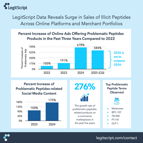 LegitScript, the leader in merchant and product certification and monitoring, today released primary research findings on peptide activity across the commercial internet, detailing how unapproved and problematic peptides have surged in visibility and availability from 2020–2025. Drawing on its multi-channel monitoring of online advertisements, e-commerce listings, and social media content, LegitScript’s data illustrates how these products are increasingly presented in ways that obscure their regulatory status.
