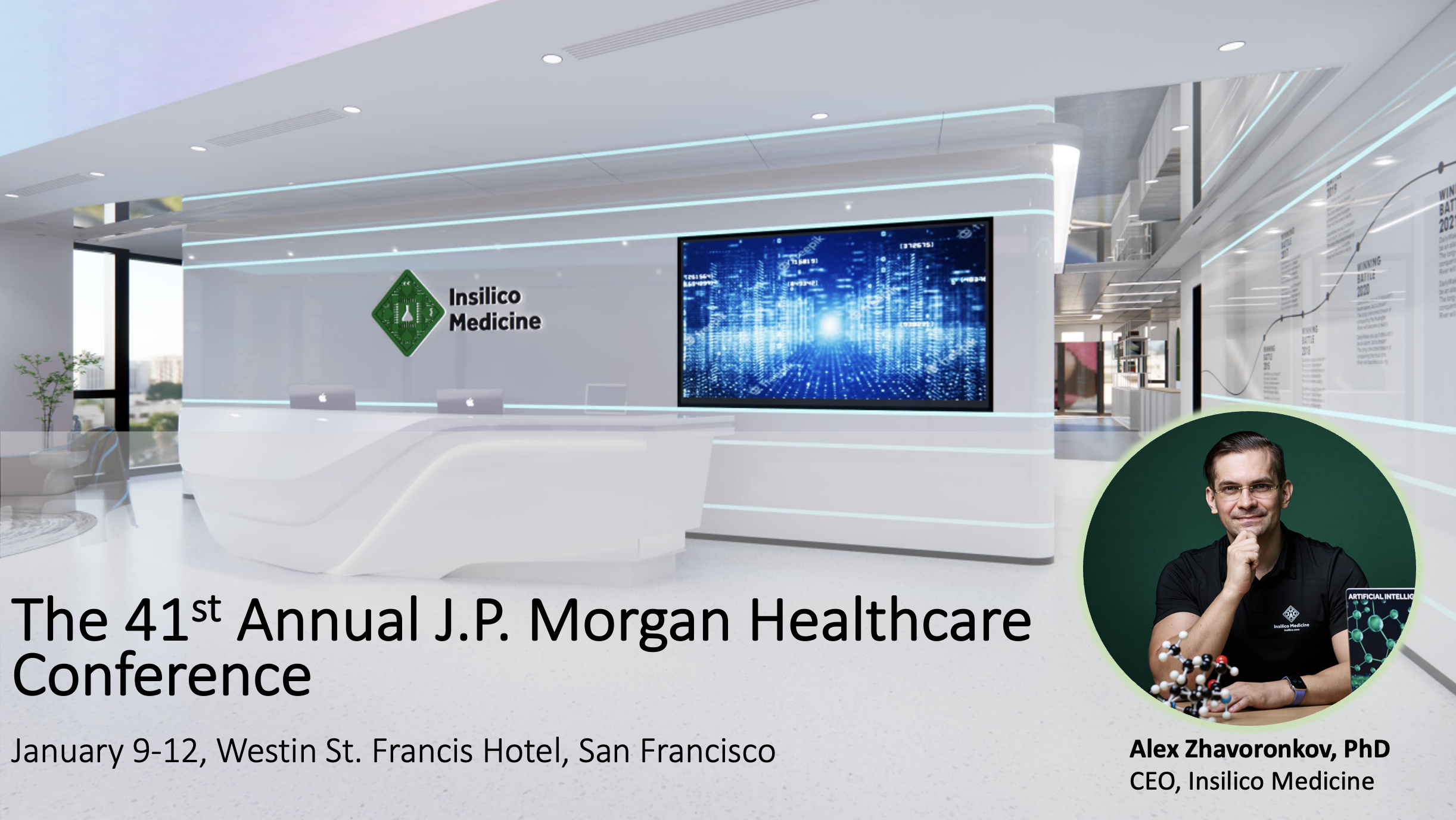 New York, Nov. 29, 2022 (GLOBE NEWSWIRE) -- Insilico Medicine will present at the 41st Annual J.P. Morgan Healthcare Meeting happening Jan. 9-12, 2023 at the Westin St. Francis Hotel in San Francisco. Representatives from the clinical stage artificial intelligence (AI)-powered drug discovery company who will be on-site for the event include founder and CEO Alex Zhavoronkov, PhD; Nirav Jhaveri, Chief Financial Officer; Michelle Chen, PhD, Chief Business Officer; and Petrina Kamya, PhD, Head of AI Platforms.