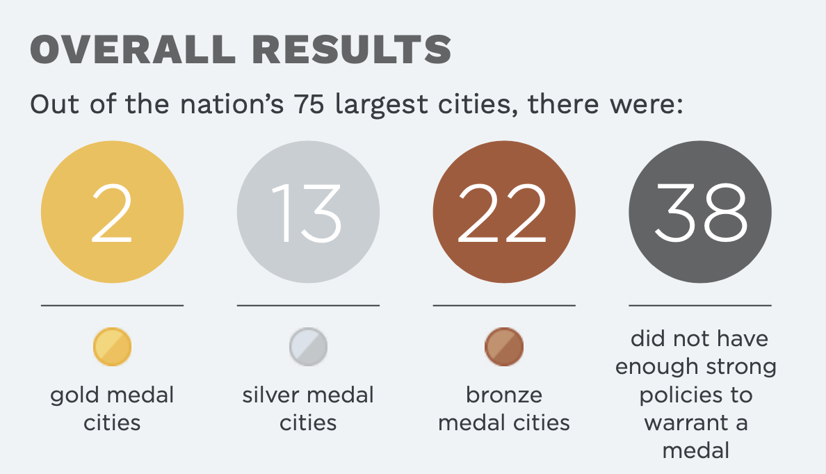 In 2022, America’s 75 largest cities earned 370 individual policy medals across all 12 policies, including 126 gold medals, 102 silver medals and 142 bronze medals. Complete results can be found at cityhealth.org.