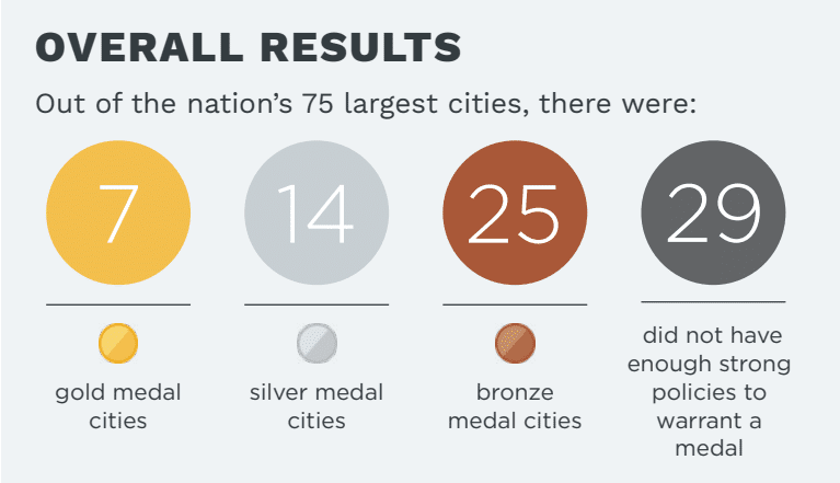 This year, seven cities — Boston, Denver, Minneapolis, New Orleans, Portland, San Antonio and St. Louis — have succeeded in earning overall gold medals. These cities qualified for overall gold by earning at least five gold medals across 12 individual policy areas: Boston, Minneapolis and Portland earned seven gold medals; and Denver, New Orleans, San Antonio and St. Louis earned six gold medals. (See the full overall medal list below.)