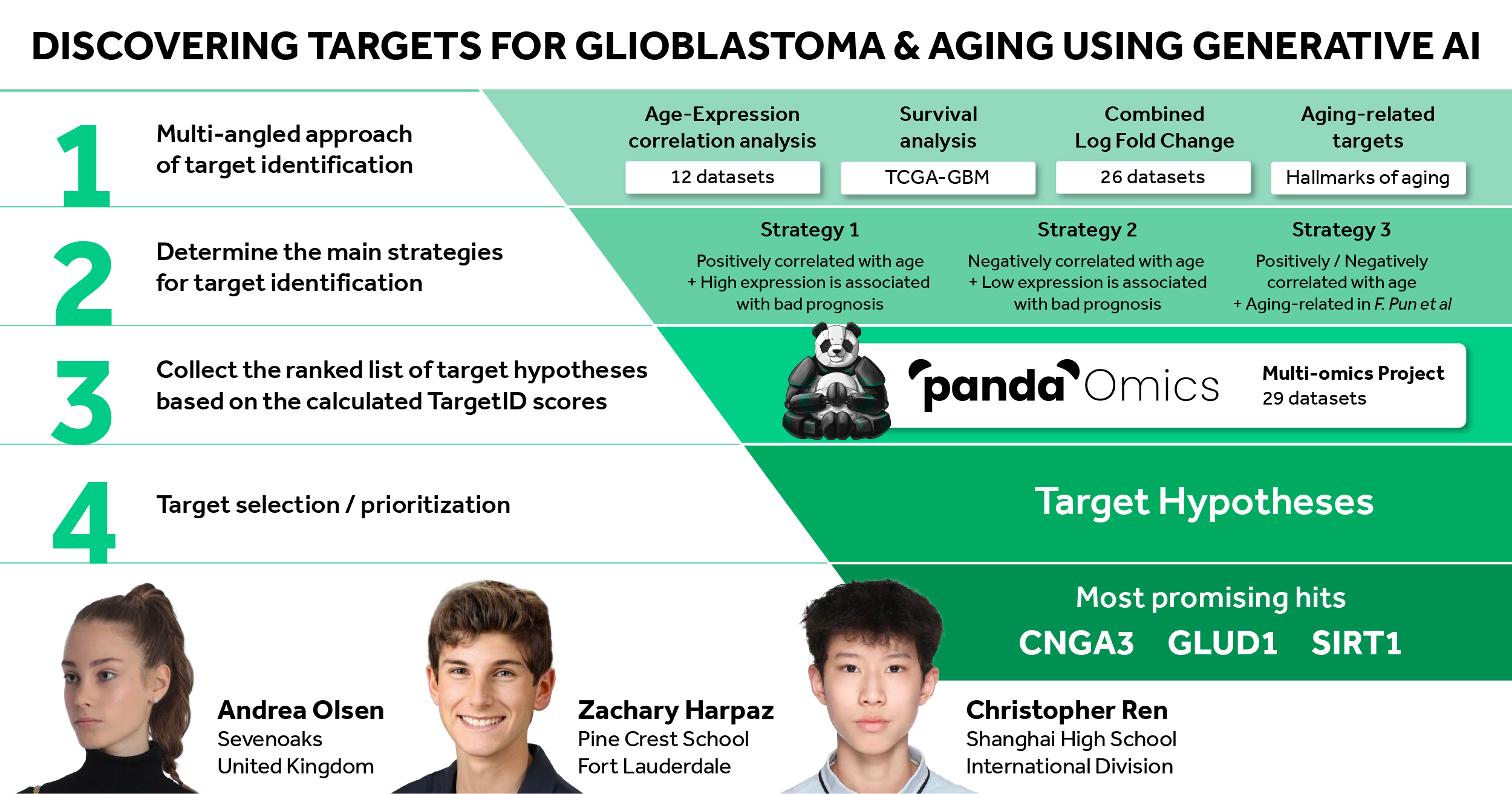 In this latest paper, the three teens used PandaOmics to analyze the genes and identified three that were strongly correlated with both aging and glioblastoma and could serve as potential therapeutic targets for new drugs.