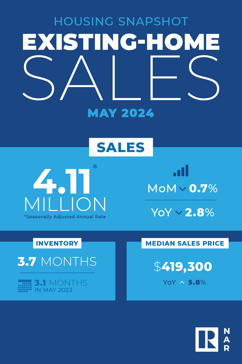 - Existing-home sales slipped 0.7% in May to a seasonally adjusted annual rate of 4.11 million. Sales descended 2.8% from one year ago.