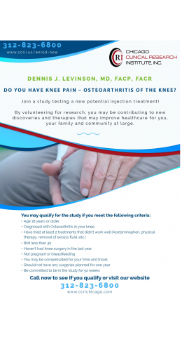Chicago Clinical Research Institute (312-823-6800) has announced its latest paid clinical trial for individuals over 50 in Bronzeville, Illinois, suffering from osteoarthritis knee pain who are interested in trying a new injection treatment.